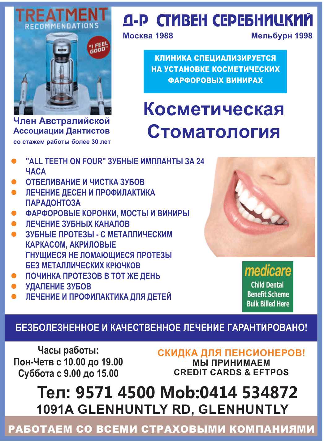 Dr. Steven Serebnitskiy offers expert cosmetic and general dentistry with over 30 years of experience. Specializing in cosmetic porcelain veneers, “All on Four” dental implants in 24 hours, and painless treatments, the clinic provides everything from teeth whitening to gum disease prevention. They are pensioner-friendly, offer same-day denture repairs, and participate in the Medicare Child Dental Benefit Scheme.